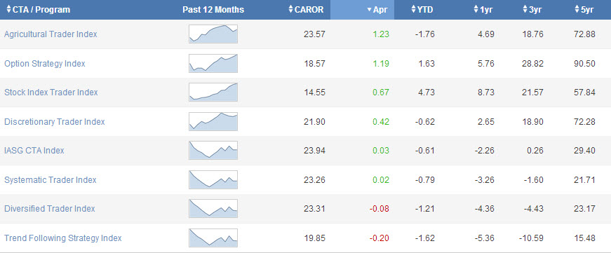 We are a little over half way through May and have approximately two-thirds of our CTAs updated through the month of April. Overall the index is flat and carried by agriculture and equity index manager trading for the month. Trend Following is so far posting a negative month with 73% of managers reporting. So overall on the year we are off to a moderate start as we get deeper into the second quarter. Without any significant trends we expect to see much of the same as the equity markets continue on the bull run. Agriculture should be particularly interesting as we head into planting season and this pig virus continues to play itself out.