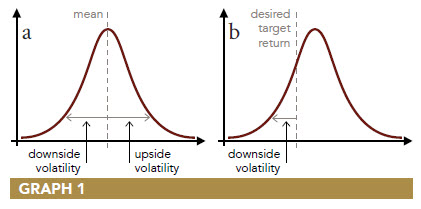 In many ways, the Sortino ratio is a better choice, especially when measuring and comparing the performance of managers whose programs exhibit skew in their return distributions. The Sortino ratio is a modification of the Sharpe ratio but uses downside deviation rather than standard deviation as the measure of risk—i.e. only those returns falling below a user-specified target (See “desired target return,” graph 1b), or required rate of return are considered risky.