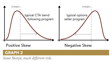 In fact, high outlier returns have the effect of increasing the value of the denominator (standard deviation) more than the value of the numerator, thereby lowering the value of the ratio. For a positively skewed return distribution such as that of a typical trend following CTA strategy, the Sharpe ratio can be increased by removing the largest positive returns. This is nonsensical since investors generally welcome large positive returns. To the extent that the distribution of returns is non-normal, the Sharpe ratio falls short. It is a particularly poor performance metric when comparing positively skewed strategies like trend following to negatively skewed strategies like option selling (graph 2). In fact, for positively skewed return distributions, performance is actually achieved with less risk than the Sharpe ratio suggests. Conversely, standard deviation understates risk for negatively skewed return distributions, i.e. the strategy is actually more risky than the Sharpe ratio suggests.