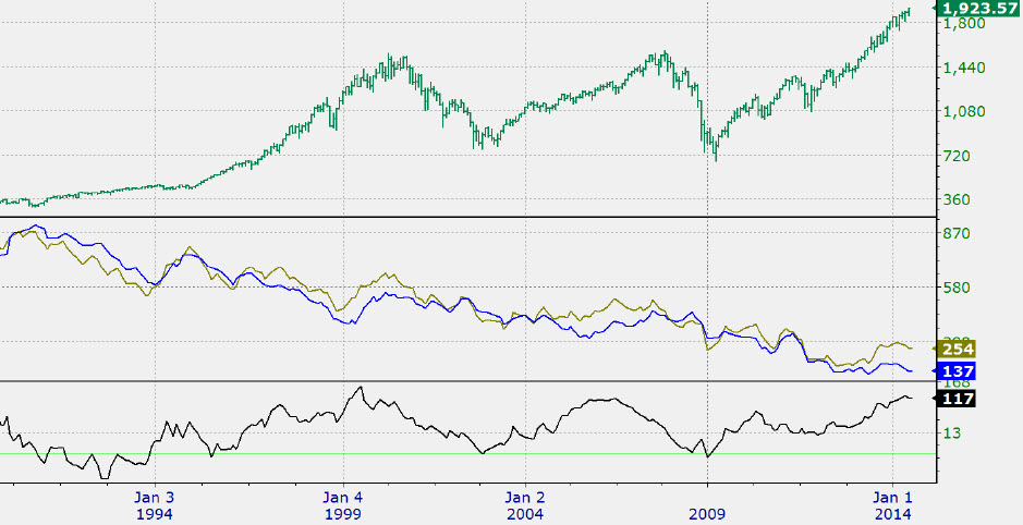 One of the biggest surprises this year has been the sharp decline in long term interest rates despite the Federal Reserve’s monthly removal of $10 billion in bond purchases to gradually reduce quantitative easing. Numerous market commentators have put forth explanations for the rate decline, touching on short covering, limited supply, economic woes, weather etc. A factor which has only been partly discussed is the correlation between European rates and US rates, especially the link between the German Bund and the US 10- year Treasury. These two have been loosely tethered to one another for more than 25 years. In the last sovereign debt crisis during the summer of 2012 Italian and Spanish long term rates stood at 7%, and have since dramatically declined, ending last year yielding 4.1%. This year rates have fallen further with both of these rates just under 3% by month’s end for an additional 110 basis point decline. In the US our 10-year Treasury ended last year yielding 3.02% while German rates closed the year with a 1.8% yield. At month’s end the German Bund was yielding 1.35% for a 45 basis point decline with the US rate dropping by an almost equal amount. The chart on the next page captures almost 25 years from 1990 to the present and portrays the S&P 500 Vs the yields on the US 10 – year Treasury (green) Vs the German Bund (blue). The bottom chart depicts the spread between these two rates. In the global search for yield the strong correlation may have been benefited holders of US bonds. As depicted in the chart, the spread between these two rates is little changed this year and the correlation between these two remains intact. Also worth noting, during times of stress this spread has inverted to below -35 basis points (as low as -65 basis point in January 2009’s flight to quality) and during prior stock market bottoms in 1990 and in 2002 a reading below -35 basis points has occurred near favorable entry points for equities based on an intermediate outlook. Past performance is not necessarily indicative of future results.