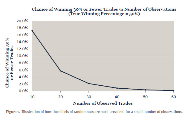 From the exercise above, it should be clear that if a trader truly has the skill, it will be more evident over the long run than in the short run. Put another way, the short-term good and bad luck offset over the long run, and all that remains is the manager’s skill or ‘market edge.’