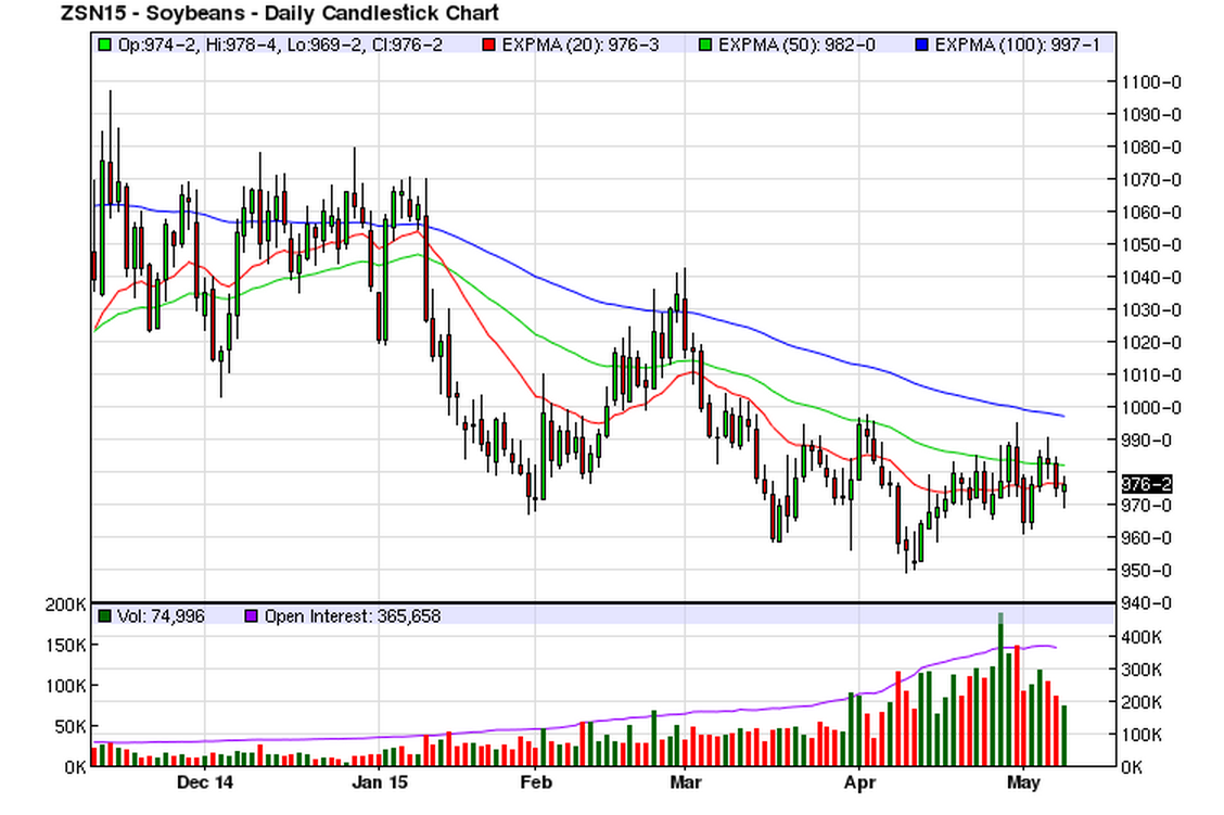 tons from one year ago. To catch up, China will have to import 35.3 mmt of soybeans for the remainder of the year (up a steep 14% from the 30.9 million from last year), in order to match the USDA forecast. The trade is anticipating the USDA to forecast a generous (near 475) new crop bean carryout in next Tuesday’s S&D report, and this number of course will be likely to take into account a vigorous 46 bu/acre yield estimate from the Ag Forum. Keep in mind that the USDA’s August first initial soy yield estimate has only eclipsed 45 bu/acre one time (which was last year), and whether the trade is willing and able to maintain this booming production estimate as we move forward into this year’s growing season is yet to be seen. Funds tallied up being short 15,000 beans, long 4000 meal, and long 31,000 oil, which lacks any clear picture as to sentiment at these historically lower price levels. Look for Tuesday’s S&D report to possibly add more bearish conviction to this market. Please take note that the May 2015 soybean contract expires May the 14th 2015.