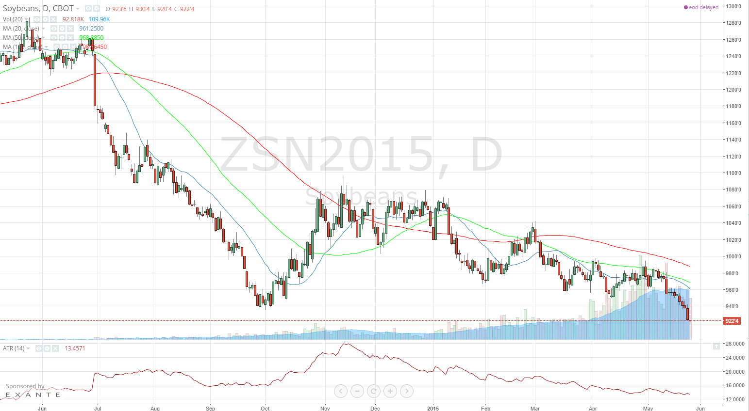 Soybean values traded lower across the board today, with July 15’ settling at 9.22 ½ off 1 ¾ cents (New contract lows). Corn also showed weakness today, closing down 5 cents at 3.55, with Wheat values plummeting 21 ¾ cents, closing at 4.93 ¼, pegging in a new seven-day low.