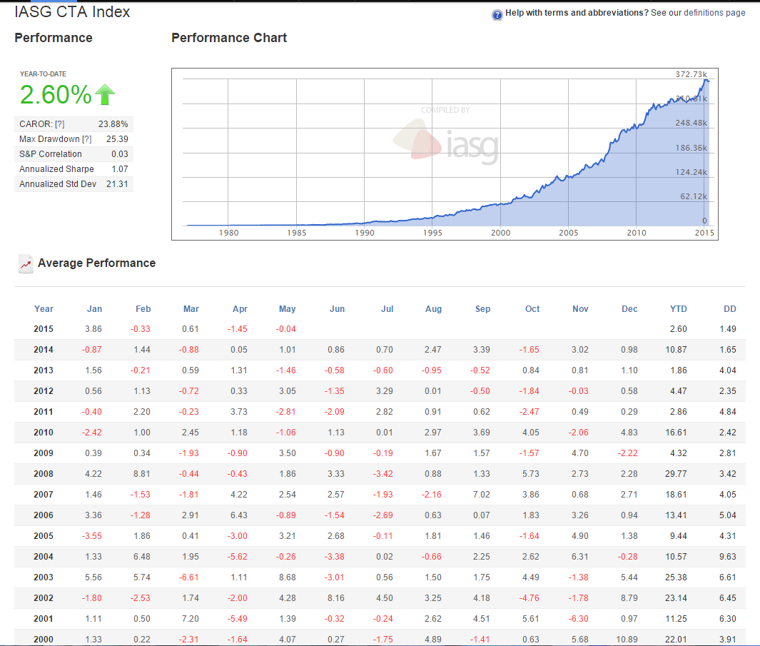 Here is a snapshot of the database as of 6/29/2015. The IASG CTA Index which comprises the managers with a minimum track record of 3 years performance and that performance must be client based. This helps to remove start up CTAs that are really in the strategy development and asset building stage. It is too early in their business to say whether they are going to be available for years to come. Stock Index, Option strategy, Agriculture, and Discretionary CTAs are atop the list of performers with Trend Following Strategies poised to post their 5th consecutive losing month in a row. Here is a snapshot of the index with performance: