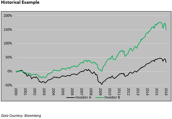 The chart below considers an alternative scenario, however. Suppose an investor had astounding foresight and reduced their equity positions in half during the two aforementioned downturns. In this case, the fortunate investor (investor B in the chart below) would have amassed a gain of 148%, approximately 4.5 times greater than an investor (investor A) who held a steadfast 100% position in the S&P 500.