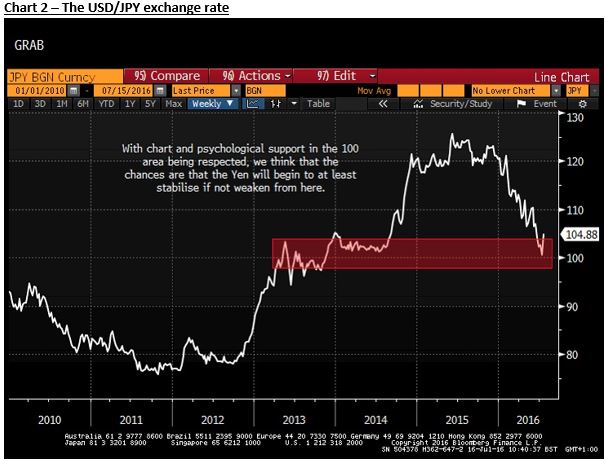 Getting back to Japan, we know that the authorities there are extremely unhappy with the recent marked strength in the Yen. Now that it appears that the monetary and fiscal policymakers are willing to unleash yet another round of whatever it takes to boost inflation, we see the conditions very much in place for another round of Yen weakness. Chart 2 below shows how the USD/JPY exchange rate, having fallen by over 20% in recent months (a falling rate is Dollar weakness and Yen strength), is finding support around the 100 area. We look for the USD/JPY exchange rate to at least stabilise around here, and most likely start to move higher again.