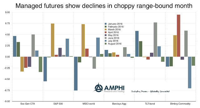 With bonds and equities following range-bound behavior, managed futures, in general, posted a negative month as measured by the SocGen CTA index. Managed futures is still positive for the year with most asset classes clustered between 2 and 8 percent except for the long bond. The high bond performance has been an outlier based on some out-sized return months associated with central bank behavior. This behavior can continue given the long duration of bonds in a low interest rate environment, but the low current yields are providing no cushion for investors.