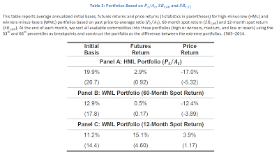 Several researchers have found momentum effects in commodity markets, so it would seem like a natural question to determine whether it is driven by behavior in the spot prices. The researchers find it is not, but they do find that spot prices are mean-reverting, which does seem consistent with the adage, “The solution to low prices is low prices.”