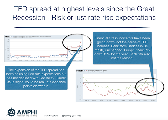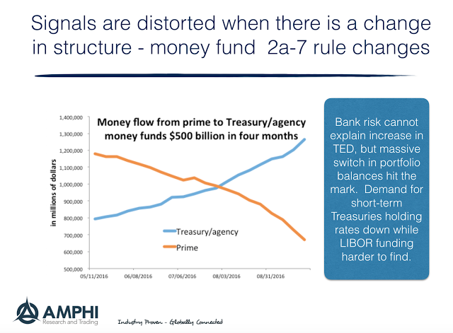 The TED spread is signaling higher funding costs from a significant change in regulation. The reforms of 2a-7 money funds is coming on October 14 and the market has been adjusting by pulling out of investments in non-Treasury short-term money sources. There has been a $500 billion money fund switch from prime funds to Treasury/agency funds. This is a large change in market share of about 15 percent. We think the money flows are the driven not risk. While we often state that prices are primal, the explanation for price moves is not always obvious.