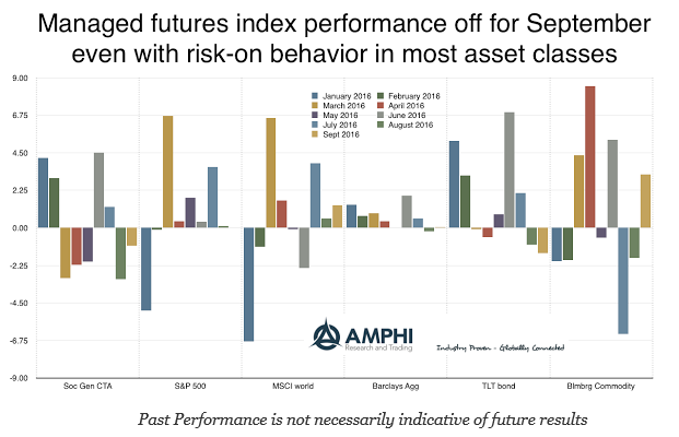 In September, some loses were associated with the reversal around the Fed mid-September FOMC meeting announcements. The positive month for major asset classes does not reveal the intra-month moves that may have hurt active long/short managers. Although there is still another of quarter trading, managed futures have not seen the same strong monthly moves found in major asset classes. This should not be surprising given the diversification of most active managers, but managed futures traders seem as though they have not be able to concentrate bets to exploit the opportunities that have appeared in markets.