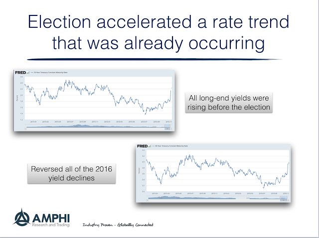 Yields exploded on the upside after the election and has seen one of the largest routs in recent years, yet it would be wrong to believe that this is all associated with the election. A close look at the trend sin yields show that the market broke above moving averages at the end of September. Using simple moving averages (20, 40, and 80-day), we would have called a change in bond sentiment weeks ago.