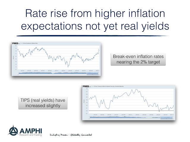 Call it a normalization of bond risk premiums based on new thinking of inflation. With long rates rising above short rates, term premiums are increasing. Longer-term inflation expectations are rising albeit to long-term policy expectations. Break-even rates are rising above last year, but TIP’s rates are increasing only slightly. This suggests that real rates may not be focused yet on a change in economic growth trend. We are moving to an environment that could be the new bond normal with risk premiums and inflation expectations back.