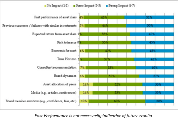 When asked about the top concerns for investing in their portfolios, the three top answers were all boar performance; what is past performance of an asset class, what is the expected return from an asset class, and where has there been success and failure with investments. Perhaps performance is always the top issue in the minds of managers, but the survey highlights particular focus during this period of transition.