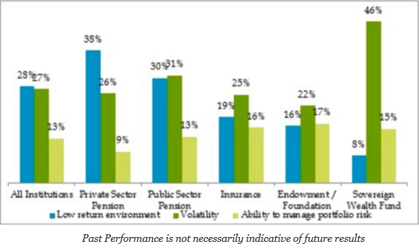 The survey also highlights the difference between endowments and pension funds. The pension funds have as their top focus the low volatility environment. For pensions, low returns create a funding gap that has to be made up through cash injections or in the case of states increases in taxes. For endowments and sovereign wealth funds, the focus is on volatility and ensuring smooth return streams and little downside risk. Given their differences, it should be expected that their asset allocations should not be the same. Pensions will focus on return and endowments will focus on diversification.