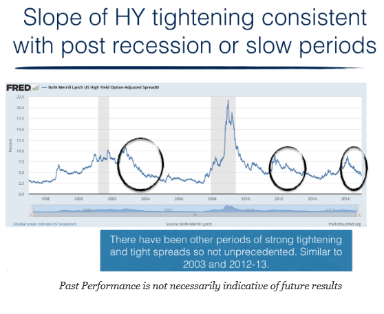 We have seen this type of tightening in 2003 and 2012-13. Both were periods of improved growth after a slowdown albeit not a recession. In 2003, the tightening was driven by the surge in Greenspan cheap money. In 2012 and 2013, the tightening was associated with the post-European credit crisis and continued cheap money from further QE action by the Fed. 2016 was the combination of higher oil prices, a Fed delay in rate increases, and an economic improvement. The 2009 spread improvement was from a change in post recession risks.