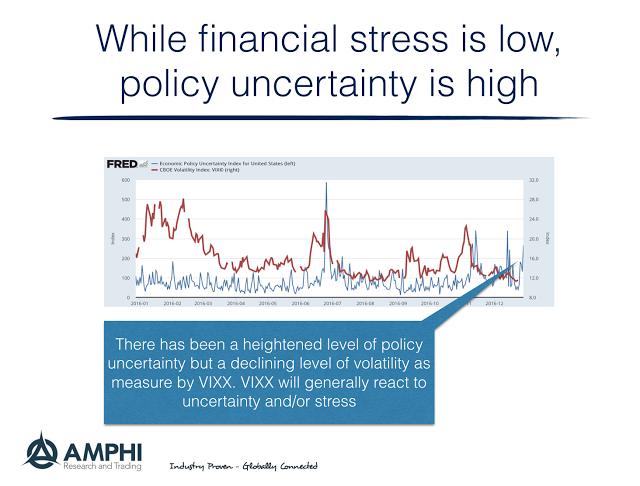Nevertheless, we do see a problem with uncertainty the cousin of stress which has moved to elevated levels. Our concern is that this uncertainty has not translated to higher volatility in markets. While the VIX volatility index may move higher without uncertainty, most strong increases in uncertainty is coupled with higher volatility. Consumer and business confidence have moved higher, but this mood may be fragile in an uncertain world.