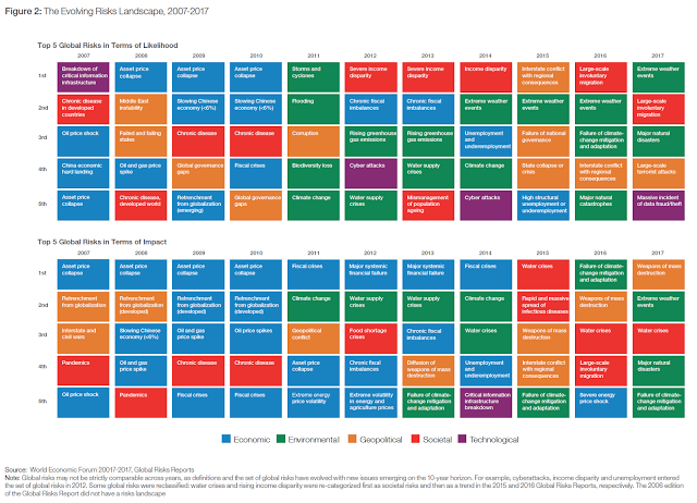 The World Economic Forum (WEF) Global Risk Report serves as a useful guide on the broader set of risks that may impact the world over the next year. This report is important because it moves outside the narrow focus of finance and looks at a broader set of risks. Nowhere are economic issues in the top five for impact or likelihood in 2017. This is a big change from the 2007-2010 period. This is the first time economic issues are neither in the likelihood or impact top five. The dominant category is environmental which suggests that commodities markets are most likely to have the immediate impact if there is a shock. Extreme weather and natural disasters have the highest impact and likelihood combination from WEF analysis