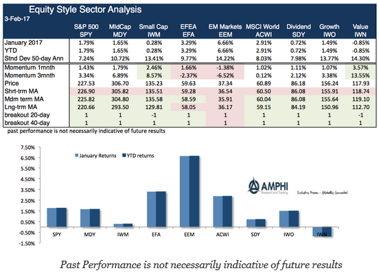 It was a positive month for risky assets, albeit more one of consolidation and than return break-out like what was seen last quester. Global markets outside of the US, especially emerging markets, showed large gains after a weak fourth quarter. The dollar gains post-election were partially reversed which added a tailwind to non-dollar investments of about 2%. After accounting for currency changes, developed non-dollar returns are back in-line with the US.