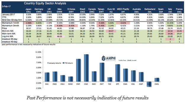 The country ETF sector showed the most variation with strong gains in Asian markets and Brazil. The weaker countries included Italy and France. Again, currency translation was a strong contributing factor.