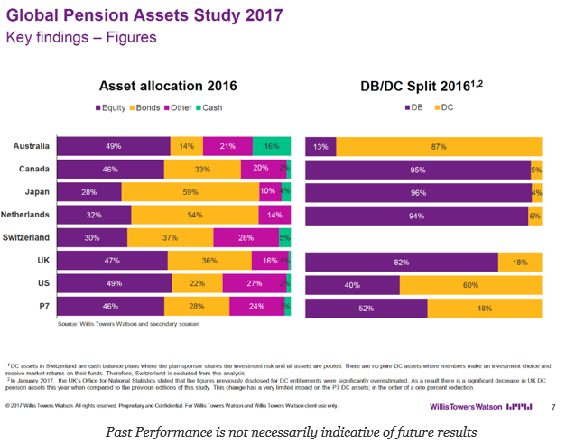 The Willis Towers Watson Global Pension Assets Study 2017 shows that the same pension trends for the last decade continue. First, the march to defined contribution (DC) plans from defined contribution (DB) plans has not abated. Of course, there are some wide variations across countries, but the good old days of getting a managed pension from a company or a state are not coming back. Second, the growth in pension assets from the major countries is slowing but continues to rise in emerging markets. Emerging markets do not have the same developed pension systems and often have pension assets well below the country GDP. There is a catch-up in EM and this is where asset growth will be seen.