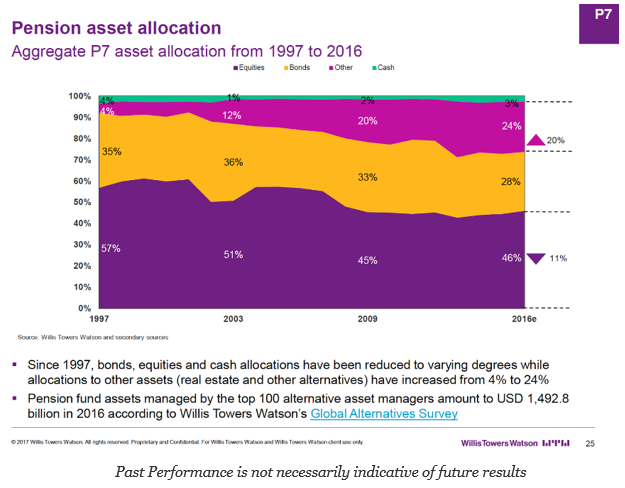 For the US, the asset allocation mix is tilted toward equities and other which will be the alternative space. The high equity exposures are a Anglo-pension focus. There seems to be a clear view that alternative can serve as a fixed income alternative. There is a potential catch-up in this allocation for other countries. Overall, for the largest seven countries with pension assets, there is a decline in equity exposure for alternatives. This trend has been in place before 2008.