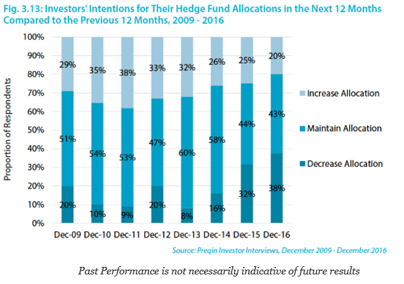 A close look at the investor intentions for hedge funds suggests that poor managers will see their allocations reduced this year. The proportion of respondents who will reduce their allocations is at the highest levels reported and about 20% higher than last year and more than double from two years ago. Similarly, the survey has lowest level of respondents willing to increase their allocations.