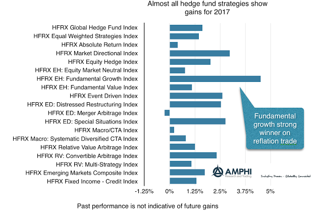 All hedge fund strategies gained for February with especially strong performance for systematic CTA’s and fundamental growth strategies as measured by the HFR indices. Managed futures showed gains because both equities and fixed income markets trended higher for the month. The fundamental growth strategy seemed to be positioned to take advantage of the global reflation trade. Other winners included market directional and distressed restructuring strategies.