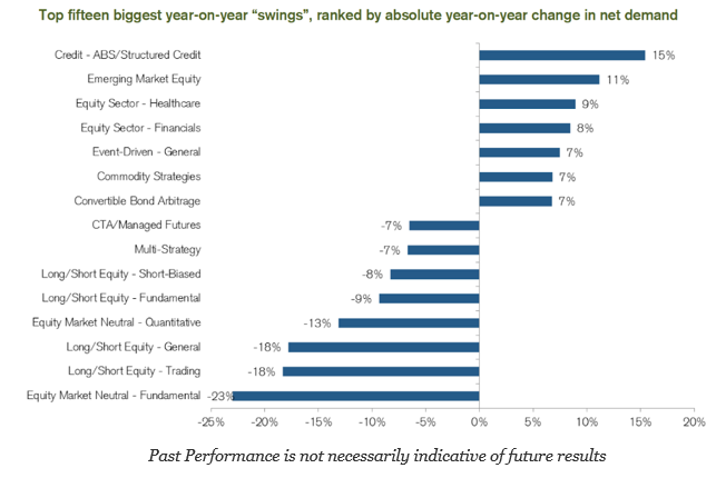 Nevertheless, there has been a decline in net demand across many strategies with strong declines in discretionary global macro and managed futures. Hedge fund investors are being more selective with their demand as opposed to a general increase across a number of strategies.