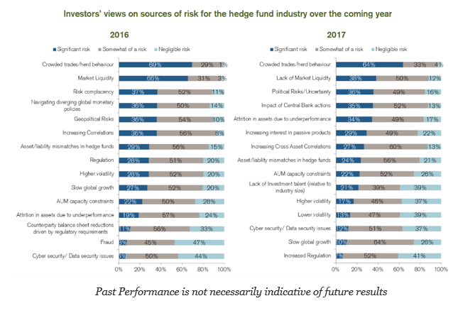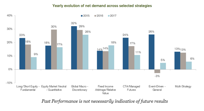 The latest Credit Suisse hedge fund survey for 2017 provides a detailed review of where there is the most investor demand for hedge fund strategies. Number one is global macro based on a desire to have greater portfolio diversification. This appetite is followed by fixed income arbitrage. The swing in demand shows a movement away from long-short equity and a movement to credit and sector specific strategies.