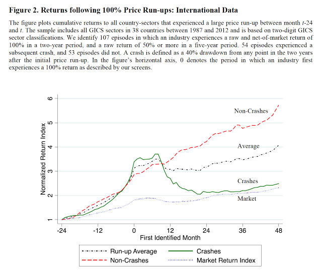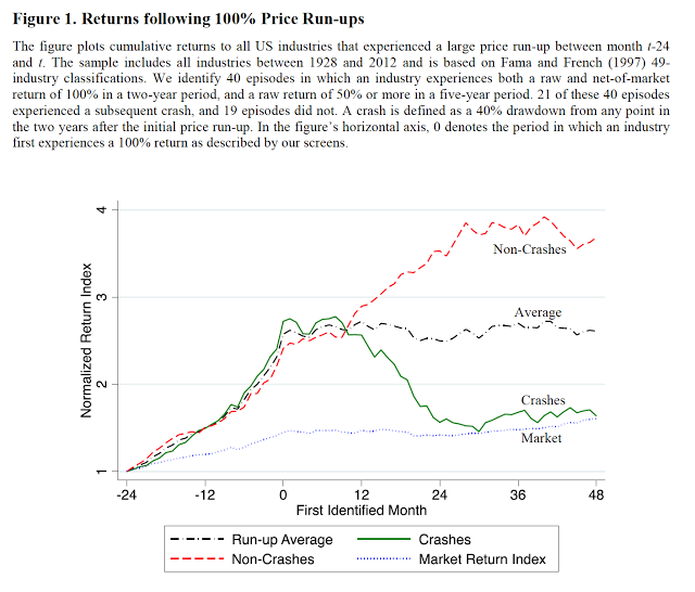 If you look at the data on bubbles, the hold your trends strategy makes sense. Momentum and trend-following is susceptible to crash risks, but the downside may not be as bad as popular narratives suggest. The paper “Bubbles for Fama” by Greenwood, Schleifer, and You takes a deep look on many price booms to determine whether they are always followed by crashes.