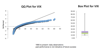 It should be noted from the QQ plot and the box plot that the distribution of volatility is far from normal. So even though volatility is low, the weight of the distribution is skewed to values below 20. This is not a normal distribution but one with significant positive skew.