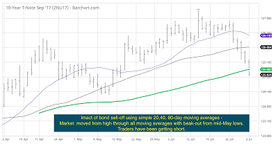 Total returns for stocks were still slightly positive for the month. Bond returns were cushioned by interest income. The extent of the market impact can be seen in our simple chart for 10-year Treasury notes. Prices have moved below the 20, 40, and 80-day moving averages which suggests that large trade adjustments from long to short may have occurred. Given the sharp decline, there were limited accrued profits from earlier trades. Given the higher volatility, many traders have lowered new position sizes.