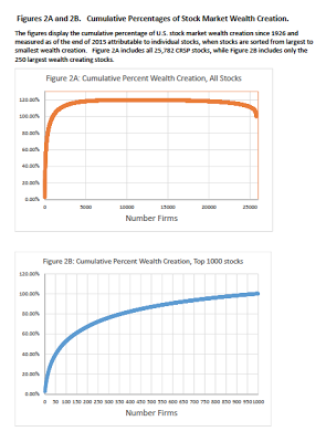 While the conclusions are based on the well-used CRSP database, this work has not be done before or has not been highlighted in basic discussions on stocks. It is sobering because it tells you how difficult it is to make money by holding a stock portfolio. There are few papers that you will read this year that will change your view of stock investing as much as this fundamentally simple work. What is most important is that this research should change your priors on what are the risks from holding stock and simple fact that buying stocks can be a lottery ticket of poor returns coupled with a few out-sized skewed winners.