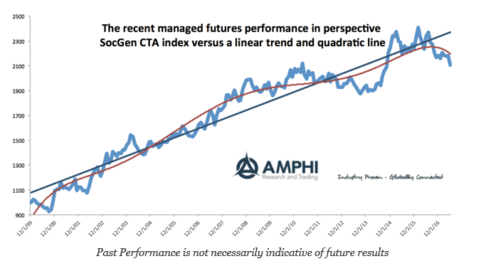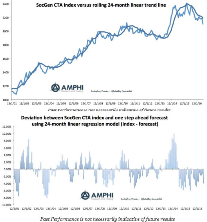 Our first chart shows the value of the SocGen CTA index since inception with a trend and quadratic line fitted through the index values. There was a clear fall below the trend in 2016, which has accelerated.