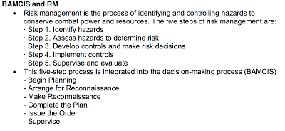 If you are going to be regimented about using risk management principles, you will need a disciplined process. The military love process and acronyms, so the Marines have BAMCIS. Nonetheless, process will give the decision-maker an edge. Repetition will reduce mistakes.