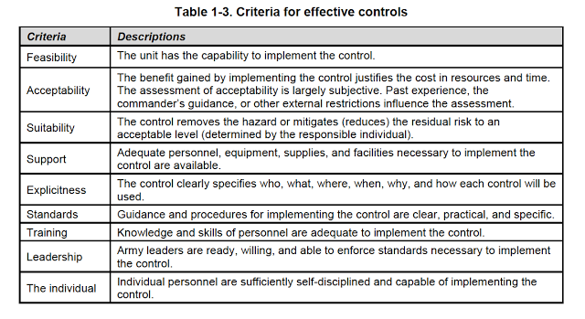Another interesting matrix from the army is their criteria for effective controls. This table tries to match activity with risk controls which help define roles in an organization. These criteria can easily be mapped into the activities of a money management firm.