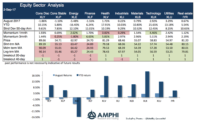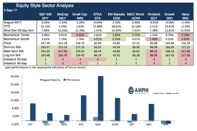 August showed growing dispersion across styles, sectors, countries, and bonds. For example, there was almost a 5% difference between holding the emerging market and value ETF’s (EEM-IWN) For sectors, there was an 8 percent differential between energy and technology (XLE – XLK) and a 3.5% difference in bonds between long-term Treasuries and high yield (TLT – HYG).