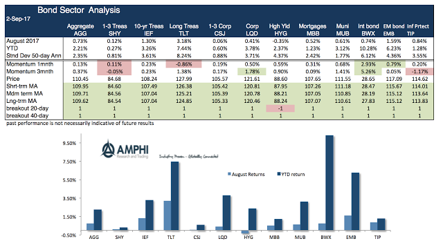 The major theme coming out of August was the mixed message of holding bonds and emerging market stocks as opposed to risky US stocks. You could think of the EM stock bond combination as a barbell around large cap US stocks. Nevertheless, these mixed messages are unlikely to continue. The pessimism embedded in bond investors versus global optimism cannot hold for long. The central bank policy meetings in September may clear up these issues.