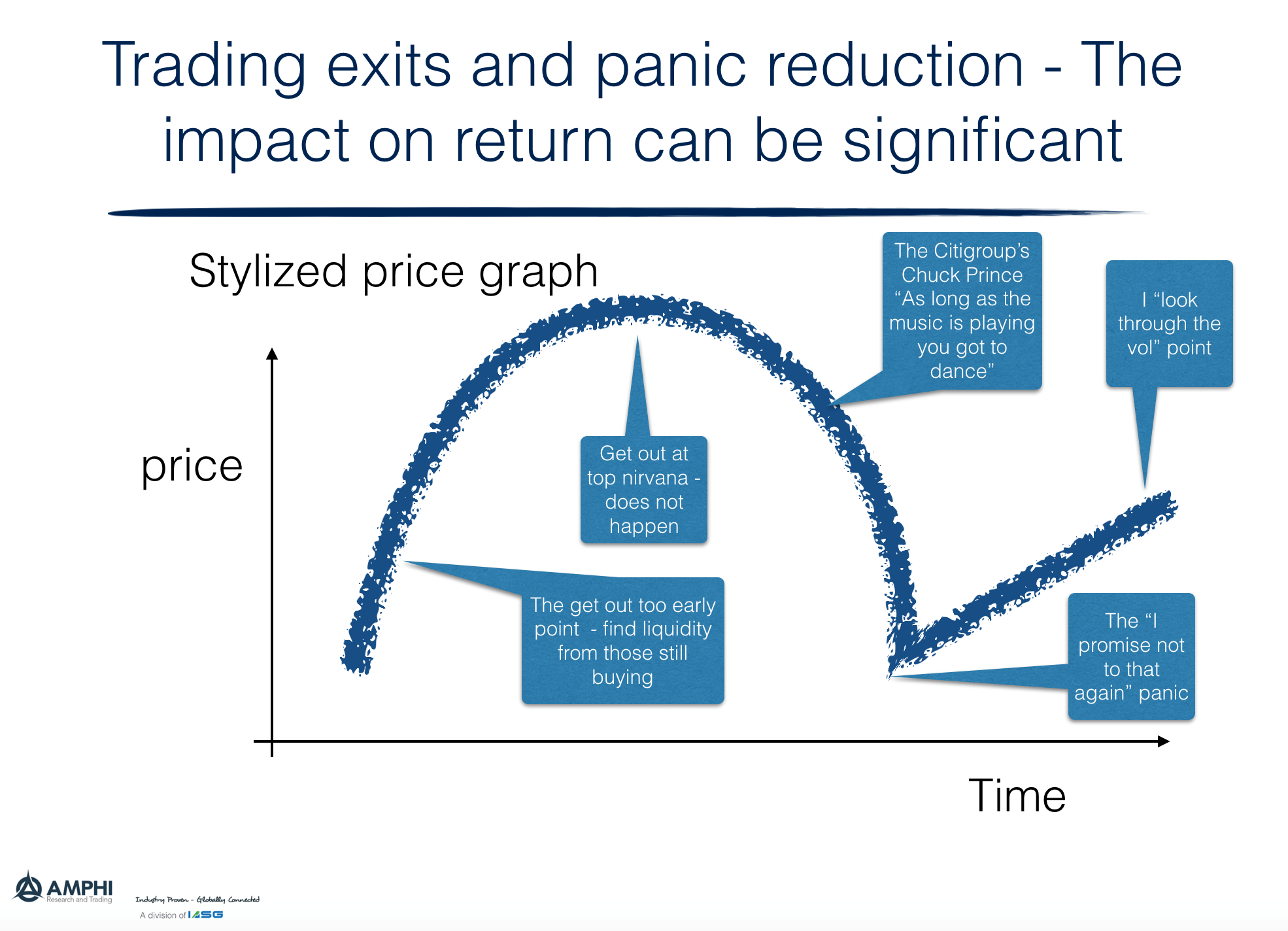 A panic only occurs if you are a late follower toward the exit. The panic occurs when you realize that the cost of exiting is higher than expected and liquidation is not moving as fast as expected. A trader can go through a mini-panic on a regular basis if an exit strategy is not planned correctly and there is a liquidity shortfall, Exit strategies are all about not panicking at those critical times, yet there are trade-offs between reducing panic and maximizing return. The control of exits as well as entries is a core issue with model building and drives incremental returns.