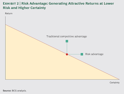 There has always been a lot of talk about the competitive advantage of a firm. For money managers, it has been about their edge. However, there is a new focus by some consulting forms about a firm’s risk advantage. (See BCG’s Henderson Institute – “Taking Advantage of Risk” and the BCG’s Perspectives piece “From Risk Take to Risk Manager”). This strategy work has focused on a firm’s “risk advantage” as an alternative to competitive advantage. Firms that manage their strategic risk options can add value relative to those that look at risk management as a police function.