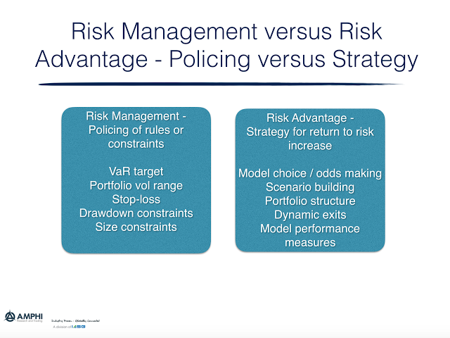 As risk premiums are further identified and enter the public domain, the firm differentiator is the ability to adjust and adapt the risk exposure. Instead of risk management as a traffic cop function, risk-taking and management is a choice which must be decided upon no different than a return choice.