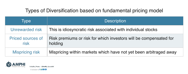 There are three types of risks that can be diversified: unrewarded risks which are the ones that can be diversified through holding a broad market basket, priced risks that are associated with risk premiums, and mispricing risks which have yet to be arbitraged away.