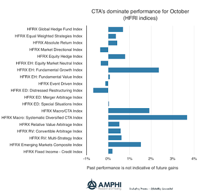 CTAs showed their strongest performance of the year in October. Only the fundamental growth strategy came close to generating the returns seen in managed futures for the month. Some strategies actually posted losses for October even with the continued increase in equity returns.
