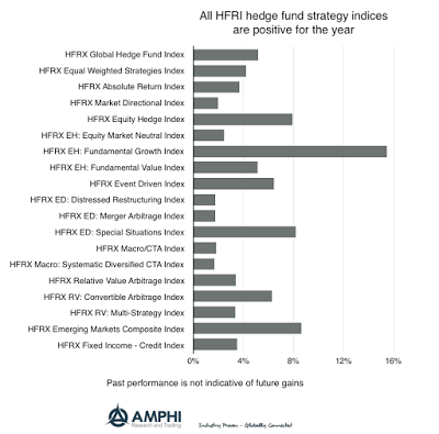 All hedge fund strategies are now posting positive returns for the year. The best returning strategies are fundamental growth, special situations, and emerging markets. Most strategies have some combination of beta and alpha generation; consequently, the strong absolute gains in equities help hedge funds with performance.