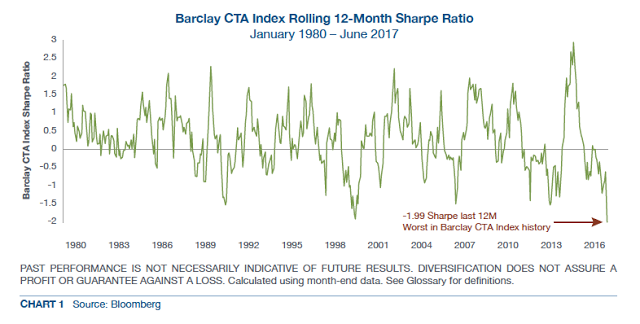 Managed futures have been in a significant drawdown with poor Sharpe ratios over the last two years, albeit October has been a good performance month. Many investors have discussed throwing in the towel and getting out of this hedge fund strategy. New investors have focused on other strategies and not wasted time with CTA’s. A simple approach of looking at recent performance would not be compelling, yet a closer examination shows that this may be one of the best times to invest in managed futures. Forget the recent performance or, more specifically, do the opposite of momentum investors and buy on the dips in risk-adjusted performance.
