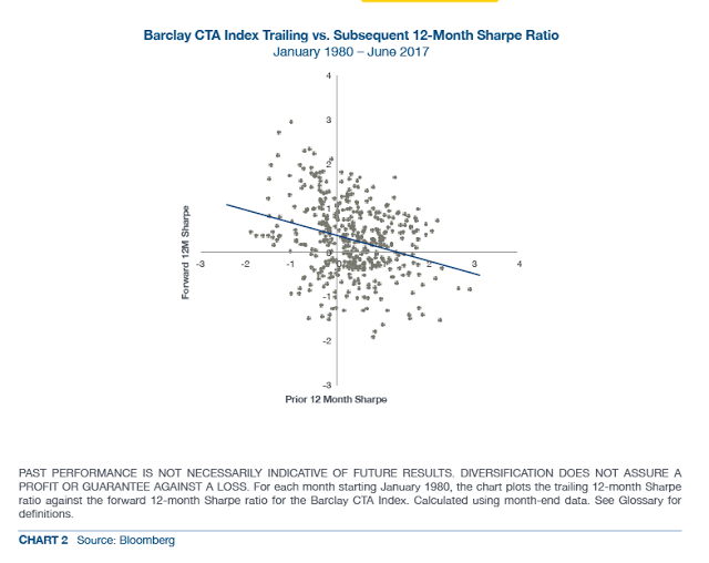 Investing in any one manager is more complex, but the general timing decision may be easier to address. For example, when the investment committee likes management futures, the least may be the period when you should love it the most. On the other hand, if you are holding managed futures and ready to divest, think again; it may be worth waiting for the reversal.