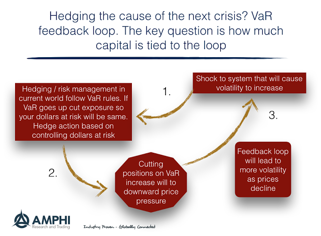 We can see a similar problem with the current risk management techniques that employ a form of hedging through cutting exposure on volatility increases. The feedback loop will add to selling when there is a volatility shock. An increase in VaR will cause investors to reduce their risk by selling the risky asset and buying the safe asset, similar to a portfolio insurance scheme. What is different is that investors will not sell just those assets that may be falling. There could be downward pressure on any markets that are seeing upward pressure on volatility. Positive feedback will actually place downward pressure on many markets.