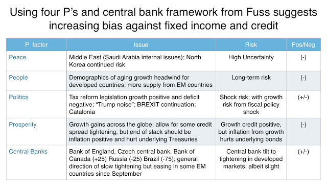 Many of the P factors are longer-term and associated with shocks, so it may not be trade worthy, but for investors who are looking at longer-term asset allocation, this type of checklist is valuable. We have made our own assessment and believe the tilt is away from the credit sector and should be focused on global diversification or strategies that can perform better if there is a global economic shock.