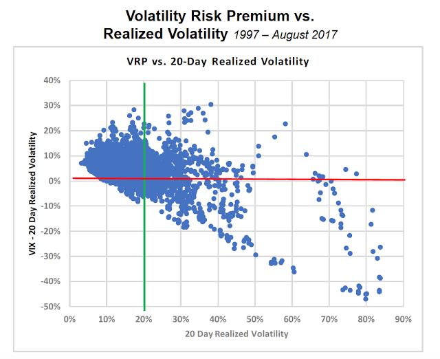 The numbers suggest that being short volatility gave you a positive premium in a stable world, but when the world is less stable, (higher realized volatility), you do not want to be a vol seller. The chart suggests that there can still be a positive risk premium when realized volatility is high, but the odds work against you. It is a way to get to a realized volatility of more than 20% at current levels, but that world can become a reality quickly if there is an equity sell-off.
