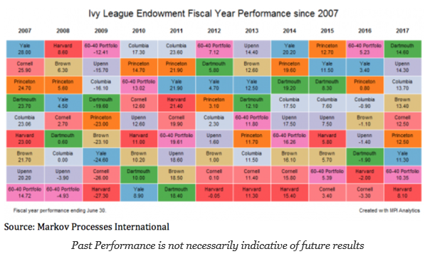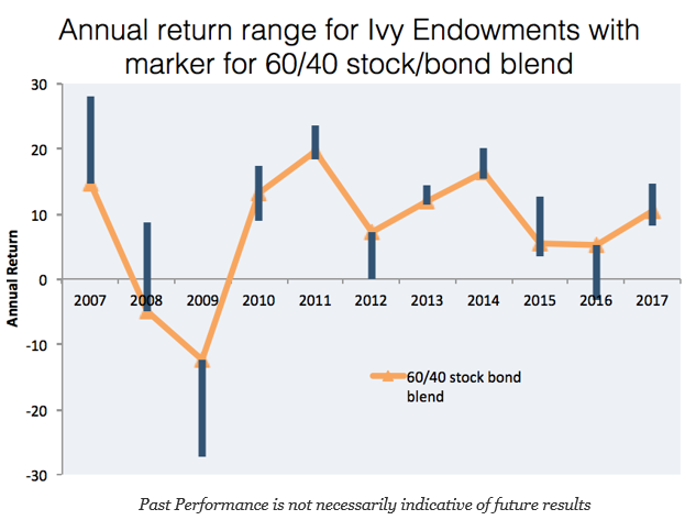 A large portion of the Ivy endowments has been associated with illiquid private equity investments. The 60/40 stock/bond investment blend is a liquid portfolio. It is possible that adding liquid assets that have higher returns than bonds or further diversification characteristics can generate more competitive returns to a simple 60/40 mix. A liquid investment strategy approach can compete with more sophisticated managers.